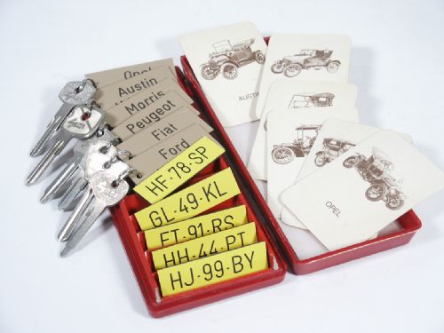 The number plate is placed upon the table next to the card and the key with tag. The number plate is shown and the card is turned over and the tag to the key is also flipped over. The name on the tag matches the automobile and the number plate matches exactly the plate number on the tag below the auto make!