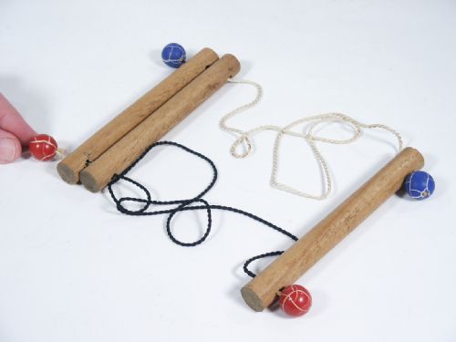 Three rods of wood that are 5 1/2" long are seen with one black cord and one white cord in a length of 23". The middle rod is moved from one end rod toward the other effecting the color change of cords! A very nice outfit in very fine condition.