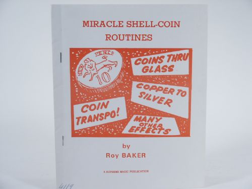 | Miracle Shell-Coin Routines, Coins Thru Glass, Coin Transpo, Copper To Silver, Many Other Effects. Published by Supreme Magic, by Roy Baker. 1979, soft cover, 7 pages. Effects: Thro' The Bottom, The Magic Mint, Thro' The Handkerchief, Thro' The Card Box, The Coins That Just Went, The Homing Coin, An Outrageous Gamble. Condition private collection identifier number, very fine. | |