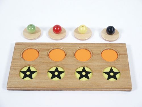 A wooden board measuring 6 7/8" x 3 3/8" having four recess areas with a star design and four without but having four wooden covers each with a different color knob is shown. A ten Pfennig coin (not supplied) is given to a spectator to place upon any plain recess and followed by covers over all the rest including the one with the coin while the magician's back is turned or he is out of the room completely. When the magician is once again present or turns back around he is able to divine where the coin is placed! Includes illustrated instructions in German and English language translation. Condition very fine.