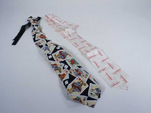 The tie on the left in the picture begins as a black tie with white polka dots and when desire the magician passes his hand from the knot at the collar down the length of the tie and it changes into the one with the card patterns. Includes instructions. Condition fine.