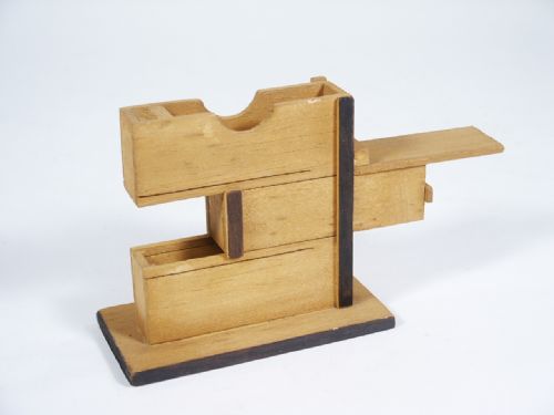 Made of wood and absent the deck of cards. A template card is included for cutting a deck for completion of trick. Includes illustrated instructions. Condition very good.
