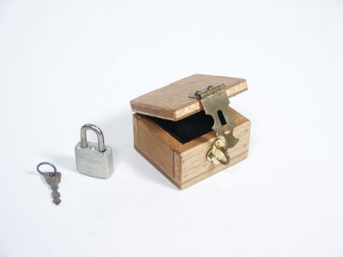With this fine wooden chest comes instructions with routining by Don Alan in which a spectator signed dollar bill that is folded and placed under a handkerchief changes into a folded paper with a key stapled in the middle of it. This key unlocks the chest and inside is the same signed dollar bill! Other great routines are given as well. In mahogany and measures 1 3/4" deep x 1 7/8" wide x 1 1/4" high exclusive of brass hardware that is affixed with slot head screws. Box is also lined inside. A really fine effect and this one in very fine condition.