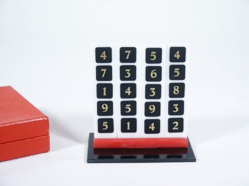 A spectator is given four paddles that measure 3 1/8" in length and asked to place in stand using either side desired as each side has five different numbers. The magician turns his back while this is being done and asks the spectator to add up the numbers and write them on a piece of paper. The magician now turns around and announces the total which the spectator arrived at! This is really a beautiful effect made in plex and one you can and will do. This comes in its own container and is so nicely made. Includes instructions. Condition First Rate.