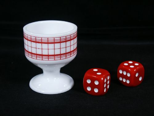 From Germany, Circa 1980's. This charming egg cup is examined by spectator and given back to magician after which is shown a die and handed to spectator. Spectator is asked to drop die into cup which is above the view of magician and spectator. Magician correctly predicts the number on the die which is uppermost! Includes an extra die as well along with illustrated instructions in German and English as well. Condition First Rate.