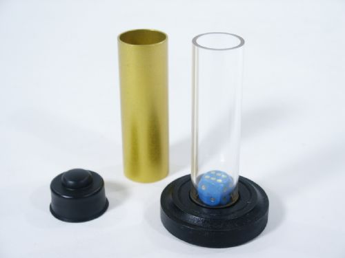 From Germany, Circa 1980's. Magician shows a clear tube which sets upon a turned wood base along with a golden cover and lid that measures 4 1/4" in height. A die is shown and placed inside clear tube and water poured in showing the die is heavier and will not float. Tube is covered and with the proper magic gestures the cover is lifted away showing the die has vanished! All parts may now be examined! Includes an extra die along with illustrated instructions in German and English. Condition First Rate.