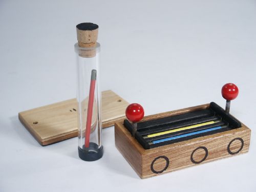 From Germany, Circa 1980's. This is another amazing mechanical piece having a wooden chest measuring 4" wide x 2 1/4" deep x 1 7/8" high to the top of retaining knobs. Also included is a clear tube of plex with cork along with three miniature wands of metal each 3 1/8" in length. Magician shows three different color wands in box asking for spectator to remove one after which the lid is placed back on. The wand is placed in tube after which water is filled in followed by cork. The tube is covered with a handkerchief (not included) and magician explains it would be difficult to remove wand with spilling the water. Just as this is said it is shown that the wand has vanished from the tube filled with water! Going back to the chest the lid is removed and it is seen that the wand has appeared back along with its little buddies! Includes instructions in German and English. Condition everything is beautiful except for a tiny amount of clear finish absence within one circle decoration.