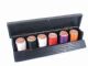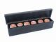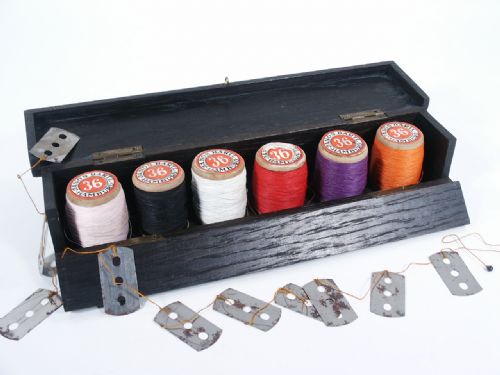 This is a very well made wooden box measuring 12" x 2 1/2" x 2 1/2" and specially made with hinges for a drop down front giving view to the special wooden spools of different color thread. The idea is for the audience to choose any color thread, followed by the magician taking razor blades and ingesting both, followed by withdrawing one end of the colored thread from mouth, followed by ten razor blades strung at intervals! Three spools are set with blades and corresponding colors, the other three are empty vessels. Blades have corrosion as expected for the age of this. This is a very scarce item from Bartl in Germany. Condition with exception of Bartl labels on thread spools everything else very fine.