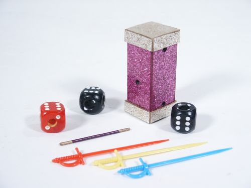 Three effects are given in the two pages of instructions 1. Where a die penetrates another die and a magic wand 2. Two dice change places 3. Red die penetrates a black die even with all dice locked with swords! This early effect stands 2 5/8" high and made of wood with sparkle laminate. Condition very fine.