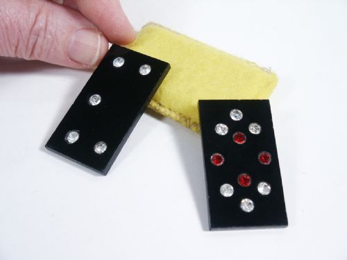 From Europe comes this set of plaques and includes the sewn felt cover which enables a switch of one for another for the finale. The plaques are 1 13/16" x 1" and inlaid with diamond rhinestones and red rhinestones. The first plaque is the standard where you show one on one side, four on the other, then turning once more you get three instead of the one and six instead of four on the other! Putting this back in the cover and then on afterthought remove again showing the one on one side and with a squeeze or magic gesture the other side is full with rhinestones! Condition very fine.