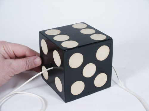 This is well made in wood with internal special hook loop which allows for the die to travel freely on cord or when set will stop and start when cord held vertical. Die is 3 7/8" in size. Condition very fine.