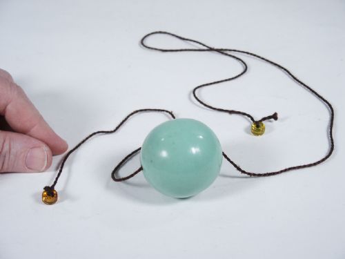 This ball is lightweight and 45 mm in size (nearly 1 3/4") with cord that has beaded ends. You set this by giving a twist of the cord near the ball to enable it to stop and start on the vertical cord or run freely. Condition very fine.