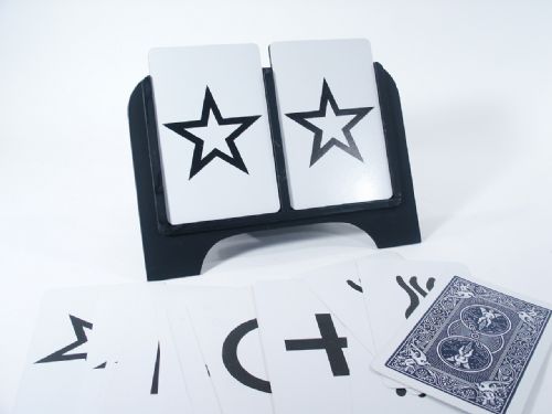 Magician displays an attractive folding stand 11 1/2" x 9" that will hold two Giant size ESP cards. He places one card in the stand back outward and explains it is the card he feels the spectator will select. He then writes a prediction and allows anyone to hold same. He now allows any spectator to examine 5 Giant ESP cards (with Bicycle Back Design) that are all different designs and to mix them thoroughly! Spectator selects any card and hands the card to the magician who places it in the stand with the first card. Spectator now reads the prediction and magician turns both cards around so they are face out and both cards match! And so does the prediction! The stand can be given for examination as there is nothing to find. Includes instructions and the Bonus of a Box of Giant ESP Cards as well. Condition very fine.
