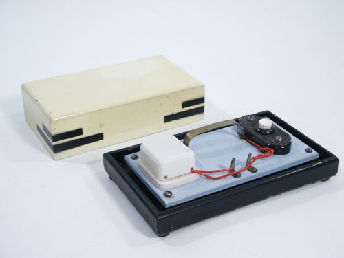 Made of wood measuring 4 1/2" x 7 5/8" x 2 1/2" high. Upon removing the lid you will see the bell, button ringer and holder for battery (not supplied). The idea is the button is pushed to ring then cover placed over all and the ringer sounds off to answer questions and the like. This has not been tested and being sold in as is condition. It is a clever method by which it operates. Includes instructions. Condition overall very good.