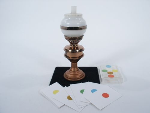 This lamp stands 8 1/2" high and it looks to have the ability to light whatever color the performer desires by way of special base mat. This includes several cards with different color dots. No instructions are given and this makes use of button batteries of which there is a style number given. This has not been tested and is sold in as is condition but appears to be in very fine condition.
