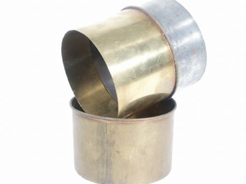 Making a drum head using paper and two round brass cylinders that are 5 3/8" in diameter with a depth of 3 3/4". The magician is then able to break through the paper and then magically produce silks, streamers, etc. (not supplied). The two brass cylinders that nest have nice rolled edges and all are shown separate in photo along with tin gimmick which holds load. Condition very good.