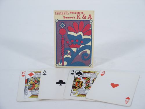 The effect is of the magician saying, he is going to show a trick using only two cards. He shows the two cards to be the two Black Kings. He then changes the Black Kings to two Red Kings! Of course, the audience knows that he has four cards, he agrees with the audience and upon showing them the four cards have turned into four Aces! This includes the photo illustrated instructions and the cards and folder are in First Rate Condition for this very hard to find, scarce Tenyo item.