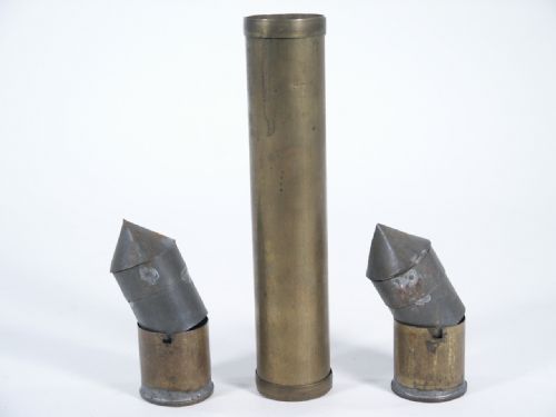This is a most unusual and Rare drumhead tube of brass which measures 8" in length with a diameter of 1 5/8" having bullet loads which are fashioned out of brass and tin with bayonet catch fittings as seen in the photo. Condition fine.