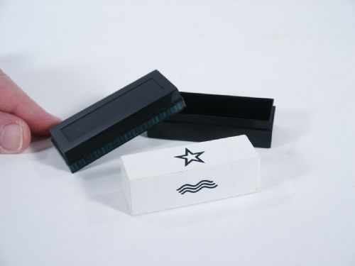A rectangular block on the sides of which are printed ESP symbols is shown and a spectator is asked to place this in a box with a cover. All of this is out of sight of the magician, yet when the magician returns, he is able to immediately announce the symbol placed face up! Includes illustrated instructions. Condition very fine.