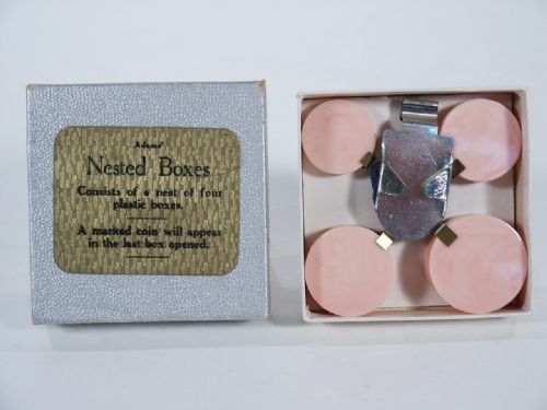 Seldom do you find an early item like this still in the unused condition in the original box. A marked coin will appear in the last box opened so the cover states! A quarter will fit within the smallest box. Condition very fine.