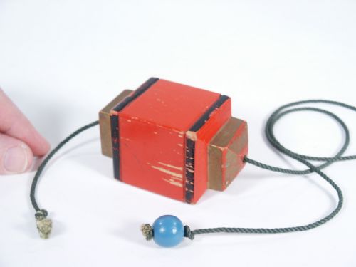 A unique shape block in lacquers of red black and gold is shown to slide freely on a cord when held vertical by the beads at either end of the cord. By command of the magician the block will slow and stop then starting again yet when the spectator is allowed to try failure will result.