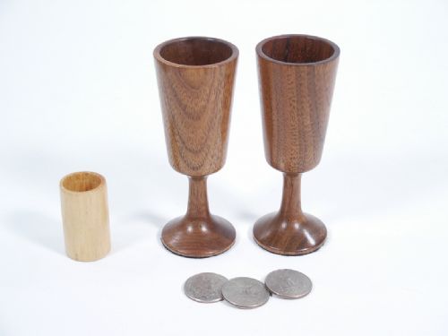 In the days when Collectors Workshop was based out of Cathedral Avenue in Washington D.C. comes this beautiful effect. Beautifully turned out of walnut wood these cups that are examinable enable for the passing of coins one at a time through and between the cups. The finale is one cup being lifted to reveal a stack of 24 dimes!