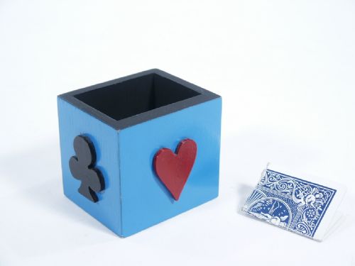 This is very well made and measures 2 1/2" wide x 2 3/16" deep x 2 1/4" high of wood. On each side of the box you will see the four card pips in dimensional cut out form. This has a spring loaded felt covered flap that upon sliding the heart pip up will release to quickly cover the folded card you have inside. It is during this action that you tip the box over into your hand which is actually holding spectators signed folded card for the revelation which gives the impression that their card has made its appearance within the box! This so nicely made. Includes some handling ideas. Condition First Rate.