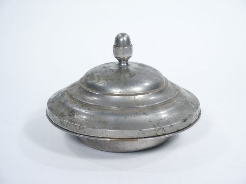 This measures 4 1/2" in height with a diameter of 7" and of metal. This is a mechanical arrangement and the lid has an acorn finial which actually is a knob to push which causes an inner plate to push down and cover the flaming bowl bringing about a production of springs flowers (not included). The bowl has dents and patina overall but if you are wanting an example of an early antique piece here you are.
