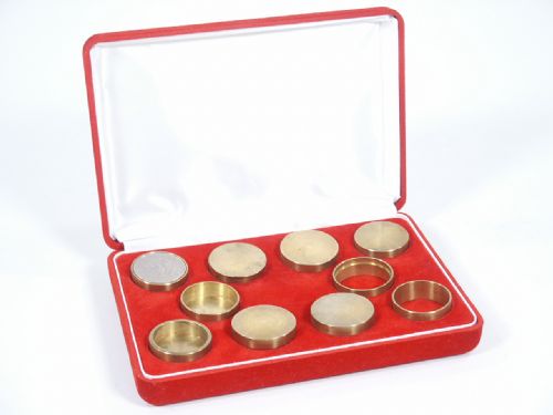 1987 Very Scarce Tenyo The Penultimate Coin Box Collection, Hiroshi Kondo. Fine Close Up Magic For The Discriminating Professional. This is quite a magnificent set of boxes for the lover of coin magic. All are quality made in brass and includes all conceivable styles with which to work which include: *Okito Box *Switch Box *Boston Box *Small Box *Rattle Box *Solid Box *Ring Box *Dynamic Box and *Fu Manchu Box. This includes 17 pages of illustrated instructions and this wonderful set is in unused very fine condition with minor tarnish. A great find for the Collector of Tenyo items.