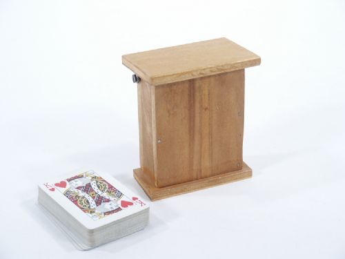 This wood box stands 3 1/4" high x 2 3/4" wide at the base x 1 3/8" deep specially made for a miniature deck of cards which is included. Three cards are named by the spectators. Deck is then shuffled and put into a small wooden box. Selected cards rise, pushing up the lid, one at a time, as called for. Last card comes up backwards, then reverses itself! Includes illustrated instructions. Condition very fine and Scarce.