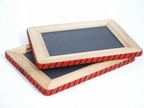 Early set with red cloth binding on edges and measuring 10” x 8”. Showing both sides of both slates to be without chalk writing they are stacked together and at the proper moment for the reveal they are separated and ghostly writing has appeared on one slate and if desired on both! Slates may be handled in a casual manner as they are locking style. A quality made item from Thayer. Includes instructions. Condition some of the red cloth banding has some material absence due to age, the set works fine in very good condition.