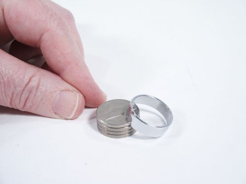 The nickels are placed into the ring and turned over with the ring being placed on the magicians finger only one nickel remains on the back of the hand! This nickel is removed and the hand turned over showing that three of the nickels have penetrated the back of the hand and are now revealed in the open hand!