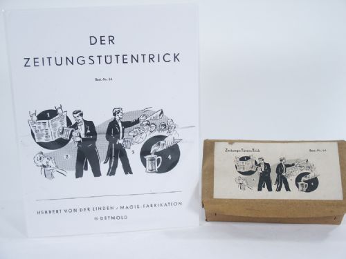 From Herbert Von Der Linden, made in Germany. Within the box you see is one of the nicest well made gimmicks for accomplishing the vanish of liquid poured into a cone made of newspaper and then having it reappear in the cone and poured back into a pitcher. Any newspaper may be used and you will have to supply only a regular pitcher of your own. Includes illustrations that make operation a breeze. In original box. Condition very fine.