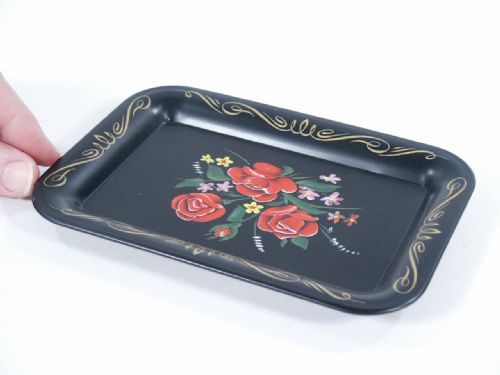 This lovely metal tray measures 6 5/8" x 4 5/8" and will hold a secret load of Bridge size cards up to 11 card capacity. Also you may use this for anything else that will fit within the hidden section. Condition fine.