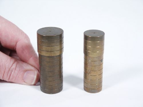 After showing both brass tubes empty, the caps are placed on after masking tape is used to seal the small tube and this placed in the larger tube which is sealed as well. A card that has been selected and signed vanishes from a deck of cards and ends up in the inner tube of the nest of tubes that has been sealed and on the table in front of the spectator the whole time! This may also be used with a banknote as well. Includes 2 pages of illustrated instructions and a real fooler to have that not many people today knew that Johnson Products made. Condition with tarnish, very fine.