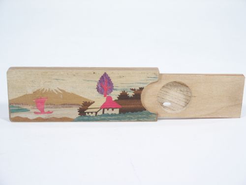 All wood and made for the vanish, appearance of a nickle size coin or the change of this size coin for that of a different value. Stamped on back, Made in Occupied Japan. Condition when the slide open well is seen there is a tiny 1/8" oval opening in the wood not affecting performance, very fine.