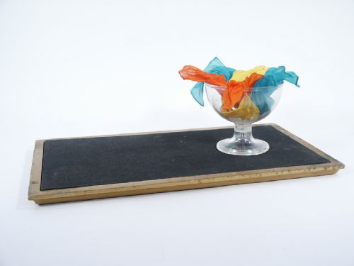 In a very magical routine, the performer shows a tray with goblet with silks and in an instant the silks vanish and I mean they are gone! The tray of wood is 18 3/8" x 10 1/4" and only 3/4" thick. You will have to set with new rubberbands and loop of string to a plastic button to complete this unit. Includes instructions and silks. Condition good.