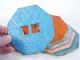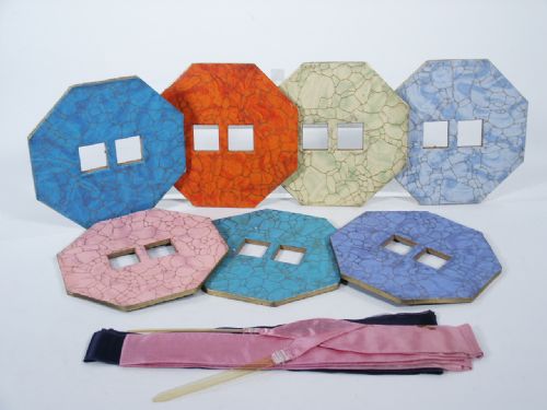 Seven placques each a different color with a nice patterned design with gold edges and measuring 4 1/4" in octagon shape. Also included are 2 ribbons with celluloid threaders. The placques are shown to the spectators to be different colors and without the magician seeing three are selected and color noted. All are turned over showing they are all black on the reverse side and the three are returned to the stack and the stack cut a few times. Once done the ribbons are threaded through the openings showing the stack hanging upon them. A silk (not included as it is normal) is thrown over the stack and magician places his hand underneath and brings forth the three placques separately! Includes illustrated instructions. Condition the placques/counters are in amazing condition considering they are from 1930. The ribbons are old and if wishing to perform the effect should probably be renewed, otherwise all in very fine condition.