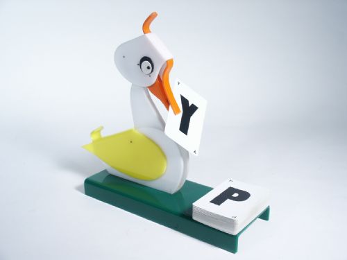 This duck is the most reliable since Warren Hamilton and in some cases even more so as it never misses pulling a card out of a deck and requires very little movement in the ring pull underneath the platform. This has lost its clear plastic houlette but works perfectly with holding the cards in your hand against the base. I personally value this as a quality made item and would not part with my own. The duck stands 9 3/4" high and the base measures 9 1/2" long x 3 1/2" deep. All made of beautiful solid plex and made to function perfectly. This includes a deck of Alphabet cards consisting of 58 in all which more than the standard when you could get them. Condition very fine.