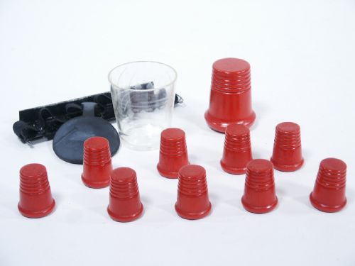 All thimbles are of turned wood and this includes 9 standard size thimbles and 1 jumbo thimble. Also included is the small glass with rubber cover and one holder for thimbles. Includes 6 pages of illustrated instructions. Condition very fine.