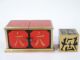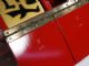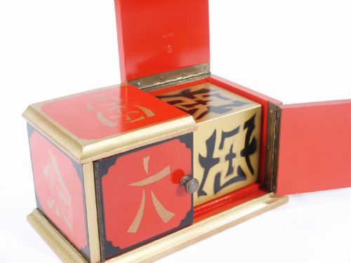 One of the first ones made and most beautiful I have ever seen. Box measures 8" x 4 1/2" x 4 1/4" high and fitted with piano hinges and has not only the sliding sound mechanism but a double door feature as well allowing for a quick peek of the side that is without the die. Beautifully finished in lacquers of red, black and gold. In this model the die is gold with black Asian stencil design. This is Hallmarked on two doors also bearing the die stamp #5. Condition beautiful!
