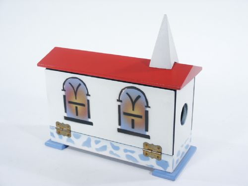 The classic silk changing apparatus made in the style of a church with stain glass windows and a steeple for those wishing to perform magic with a message. Made of wood and measures 8" long x 3 1/2" deep x 8" to top of the steeple. Condition very fine.