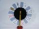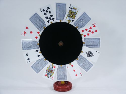 What you have is a stand 11 1/4" high with a wheel of 8" in diameter with 16 clips around the edge for holding either cards or billets or small envelopes which may contain a prediction. Made of wood and wheel will turn on its axis. Cards pictured not supplied. Condition fine.