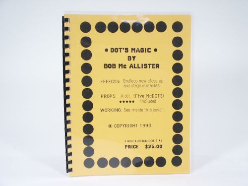 | By Bob Mc Allister. 1993, gbc bound, 24 pages, illustrated. Effects: Linking Rings, The Mc Allister Dot Key Card, Dot's Da Card, Dot's A Coin Penetration, The Paper Fold, Miracle Vanisher, The Mc Allister Slice, Dot's Da Way To Vanish A Silk, Dot's A Pennytration, Dot's A Squeaker!, Dot's A Mind Reading Assistant, Dot's A Card Box, Dot's In Da Box, Sawing A Lady In Half, Dot Was Smaller, Dot's A Thought. Booklet only. McDots not included. Condition fine. | |