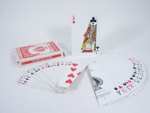 By Bob Haskell. The most totally different card trick for professional or amateur use. The special deck is cut diagonally, which fact in itself creates first interest. The audience effect is amazing. After viewing the act they still do not believe it can be done. An ideal trick for groups of from 3 to 3000. It renews interest in card tricks in general because it appears so improbable. Two spectators each select a half a card when both halves are put together they form a complete card!