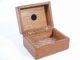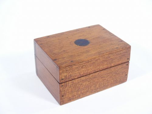 Made of Mahogany wood, measures 4" wide x 2 3/16" high x 3" deep and has a wood flap that matches with black spot the inside lid of the box. This flap is also covered on reverse with the back of a Steamboat card which should give some idea of the age. Brass hinges are inset. Condition fine.