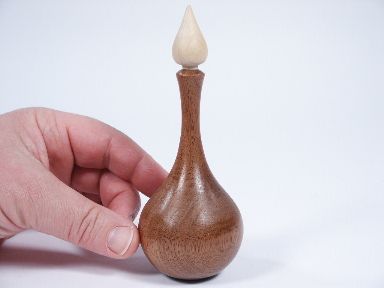 Where does one begin when a piece of magic has such incredible features setting it apart from all others ever made! This gorgeous bottle of select walnut with a maple wood stopper stands 5 3/8 inches high and is a wood turning masterpiece unlikely to ever be duplicated. The magician is able to cause the bottle to remain in a horizontal rest upon the table and when the spectators are allowed to try and duplicate this feat they always fail as the bottle bobs up into a vertical position. Nothing is added or taken away and it is made with a locking mechanism which allows examination at the conclusion of the effect. Includes 2 pages of instructions and a red velvet drawstring bag. Scant few of these were ever made putting this in the very scarce category. | |