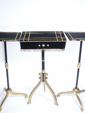 The pair of Junior side stand tables stand 33 3/4 inches high with 13 inch tops. The Colonio Table stands 33 1/4 inches high with a 13 inch x 18 1/2 inch top having a Billiard Ball well with opening to accommodate 1 1/2 inch balls. The well has a slight ramp and is 8 inches long. The Drape is of Silk Velvet and the fringe is Gold Bullion. Aside from paint absence due to rubbing in transit this set in very fine condition and includes the Wood Carry Case from Thayer. This set of tables is Thayer Quality throughout. | |