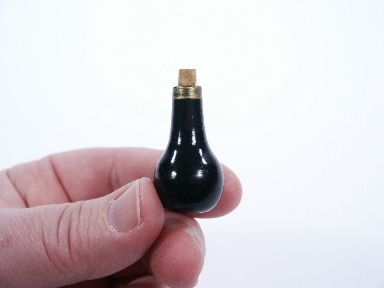This little charmer is only 1 3/8 inches high made of wood and having a nicely finished gimmick. This is the classic Imp Bottle Thayer style. Condition beautiful. | |