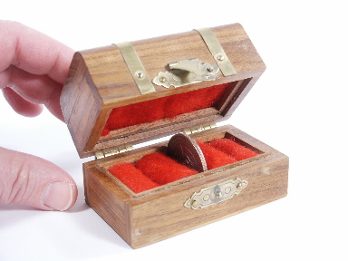 The magician asks the spectator to take a coin (this is made for use with any half dollar size coin) and place it into any one of the three available positions in this chest and close the lid followed by snapping shut the hasp. Without opening the chest (wouldn't be much of a trick if you did) the magician is able to correctly divine which position in which the coin resides. This handsome little chest is made in the style of a hump back steamer trunk. The chest measures 3 1/8 inches wide x 1 15/16 inch high x 1 15/16 inch deep with brass strapping. Coin not supplied. A signed piece. | |
